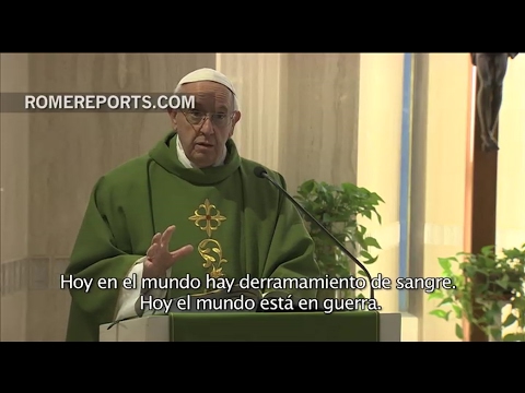 “Hoy en el mundo hay derramamiento de sangre. Hoy el mundo está en guerra. Tantos hermanos y hermanas mueren, también inocentes, porque los grandes, los potentes, quieren un pedazo más de tierra, quieren un poco más de poder o quieren obtener más ganancias con el tráfico de armas. Y la Palabra del Seños es clara: ‘De su sangre, o sea de su vida, yo pediré cuentas; pediré cuentas de esto a cada ser vivo y pediré cuentas de la vida del hombre al hombre, a cada uno de sus hermanos’. A nosotros también nos parece que estamos en paz aquí. Pero el Señor pedirá cuentas de la sangre de nuestros hermanos y hermanas que sufren la guerra”.